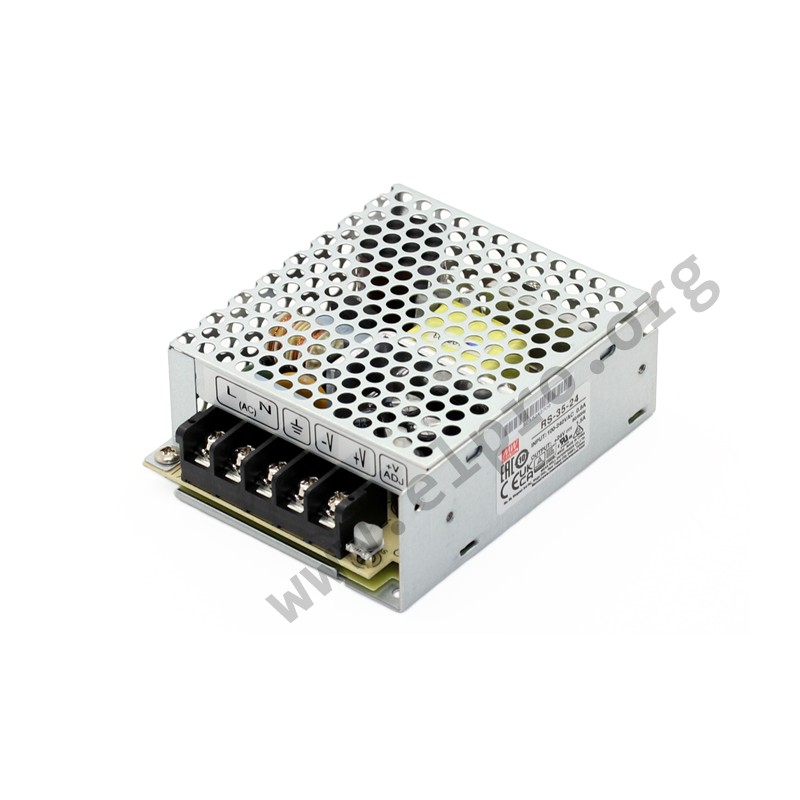 Switching power supplies in an enclosed housing with 35W, screw terminals and a universal input. These devices have long life caps (105°C) and are protected against overload (auto recovery), overvoltage as well as short circuit. They have a high reliability, a long service life and comply with EN62368-1, EN55032 class B, EN61000-3-2 as well as EN61000-3-3. We offer the following types of this Mean Well series: RS-35-3.3, RS-35-5, RS-35-12, RS-35-15, RS-35-24 and RS-35-48.