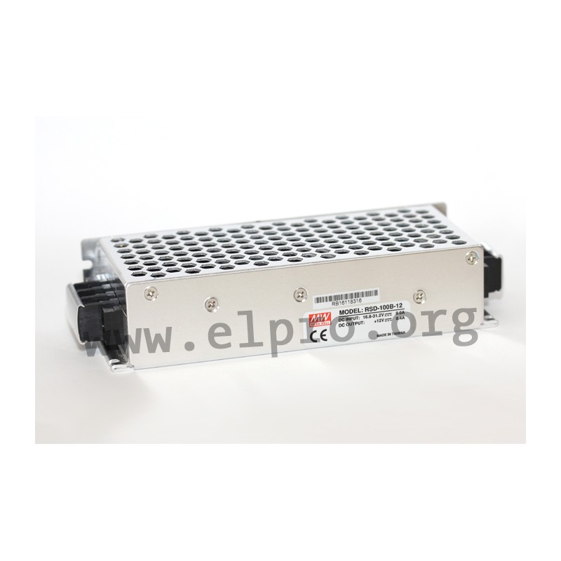 DC/DC converters in an enclosed housing (1U/36mm) with 100W, an LED indicator for power on, an input voltage ratio of 2:1 and screw terminals. These devices are suitable for rail industry applications and are protected against overload (auto recovery), short circuit, input voltage reversal as well as overvoltage. They have a regulated output voltage, are using high-quality long life caps (105°C) and comply with UL62368-1, IEC62368-1, EN50155, EN45545-2 as well as EN55032 class A. We offer the following types of this Mean Well series: RSD-100B-5, RSD-100B-12, RSD-100B-24, RSD-100C-5, RSD-100C-12, RSD-100C-24, RSD-100D-5, RSD-100D-12 and RSD-100D-24.