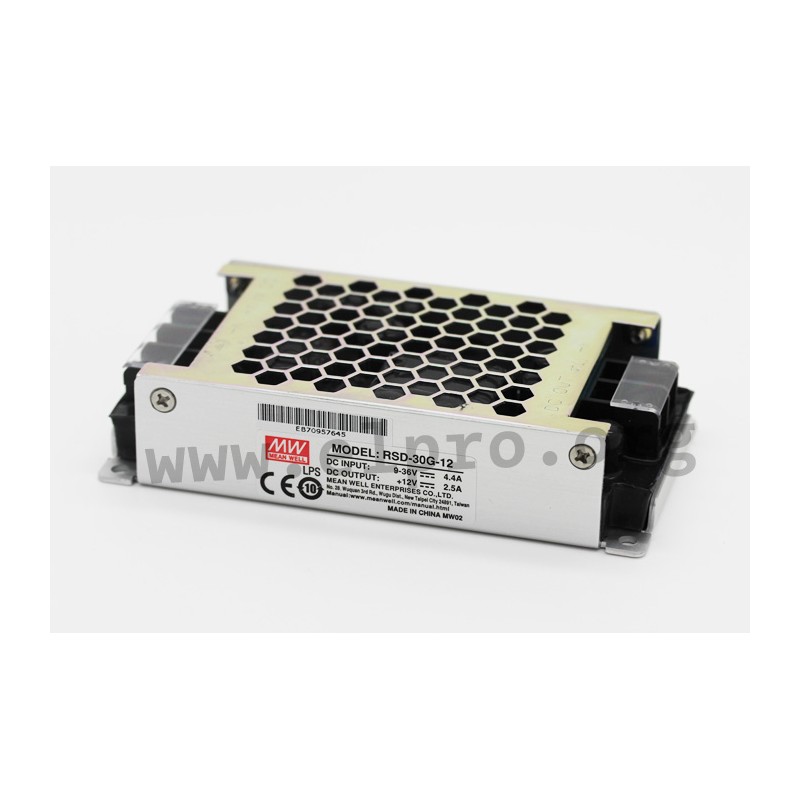 Converter modules in an enclosed case with 30W, a low profile (25mm, 1U), screw terminals and an LED indicator for power on. These devices are half encapsulated, have a built-in constant current limiting circuit, a wide input voltage ratio of 4:1 and are protected against short circuit, overload, overvoltage as well as input reverse polarity. They are suitable for applications in rough and very dusty environments with high vibrations and extreme temperatures (railway), require no minimum load and comply with IEC609502-1, EN55032 class B as well as EN45545-2. We offer the following types of this Mean Well series: RSD-30G-3.3, RSD-30G-5, RSD-30G-12, RSD-30G-24, RSD-30L-3.3, RSD-30L-5, RSD-30L-12, RSD-30L-24, RSD-30H-3.3, RSD-30H-5, RSD-30H-12 and RSD-30H-24.