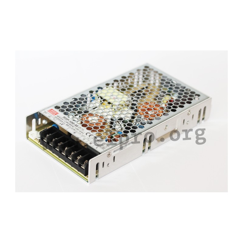 Switching power supplies in an enclosed housing with 100W, a low profile (1U), screw terminals and a universal input. These devices are suitable for control cabinet mounting (19") and are protected against overload (auto recovery), overvoltage as well as short circuit. They have a built-in remote ON/OFF control as well as a built-in active PFC function and comply with UL/EN62368-1, EN61558-1, EN55032 class B, EN61000-3-2 as well as EN61000-3-3. We offer the following types of this Mean Well series: RSP-100-3.3, RSP-100-5, RSP-100-7.5, RSP-100-12, RSP-100-13.5, RSP-100-15, RSP-100-24, RSP-100-27 and RSP-100-48.