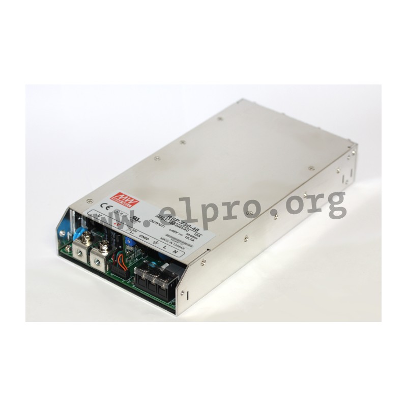 Switching power supplies in an enclosed housing with 750W, screw terminals, a DC OK signal, a trimming function for output voltage / output current (40 to 110% / external voltage 2 to 5,5V DC), a fan, a built-in remote sense function, a low profile (1U), a built-in auxiliary power (standby 5V/0,5A) and a universal input. These devices have a built-in active PFC function and are protected against overload (auto recovery), overvoltage as well as short circuit. They are suitable for control cabinet mounting (19") and comply with UL/EN62368-1 as well as EN55032 class B. We offer the following types of this Mean Well series: RSP-750-5, RSP-750-12, RSP-750-15, RSP-750-24, RSP-750-27 and RSP-750-48.