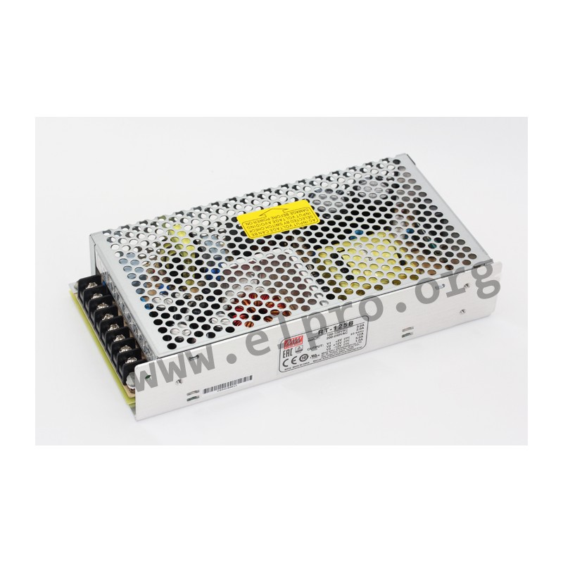 Switching power supplies in an enclosed housing with 125W, screw terminals, a universal input and a triple output. These devices are using long life 105°C electrolytic capacitors and are protected against short circuit, overvoltage as well as overload (auto recovery). They comply with UL62368-1, EN62368-1, EN55032 class B as well as EN61000-3-2. We offer the following types of this Mean Well series: RT-125A, RT-125B, RT-125C and RT-125D.