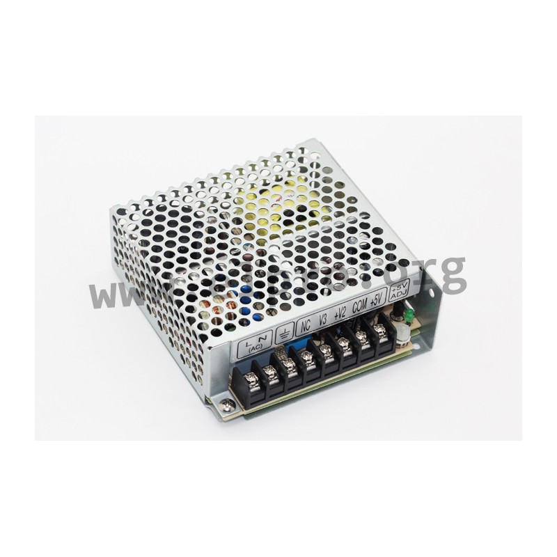 Switching power supplies in an enclosed case with 50W, screw terminals and a universal input. These devices are using 105°C long life electrolytic capacitors and are protected against overload (auto recovery), short circuit as well as overvoltage. They have a triple output and comply with EN62368-1, EN55032 class B as well as EN61000-3-2. We offer the following types of this Mean Well series: RT-50A, RT-50B, RT-50C and RT-50D.