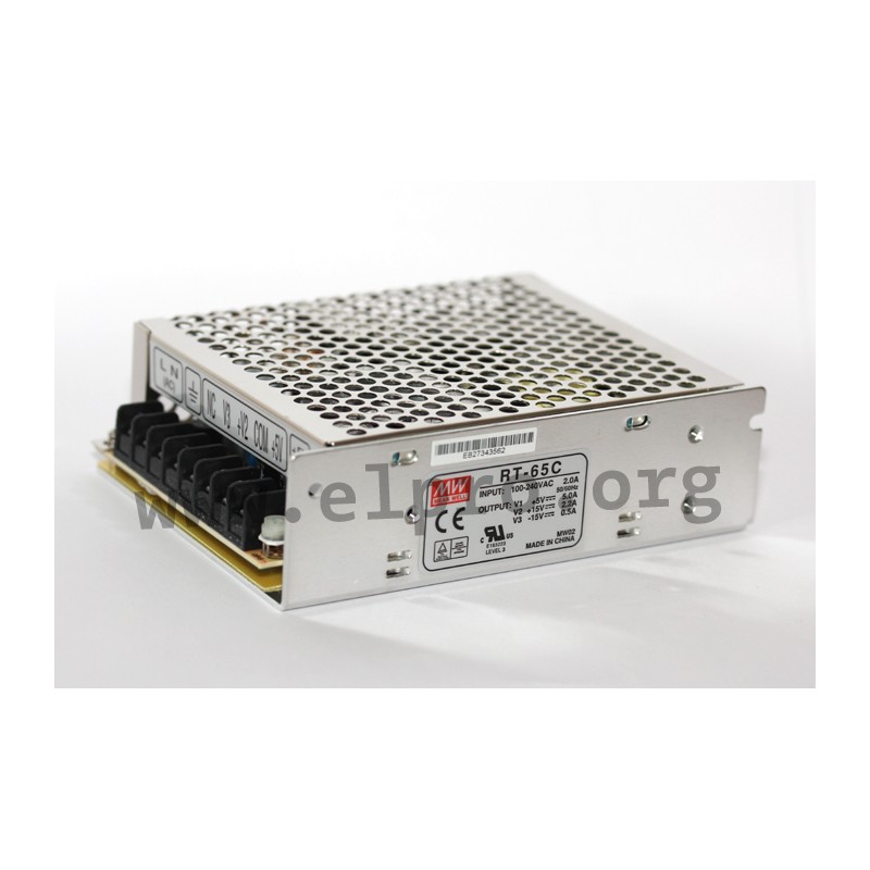 Switching power supplies in an enclosed housing with 65W, a triple output, a universal input and screw terminals. These devices are using 105°C long life electrolytic capacitors and are protected against overload (auto recovery), overvoltage as well as short circuit. They have a high reliability and comply with UL62368-1, EN62368-1, EN55032 class B, EN61000-3-2 as well as EN61000-3-3. We offer the following types of this Mean Well series: RT-65A, RT-65B, RT-65C and RT-65D.
