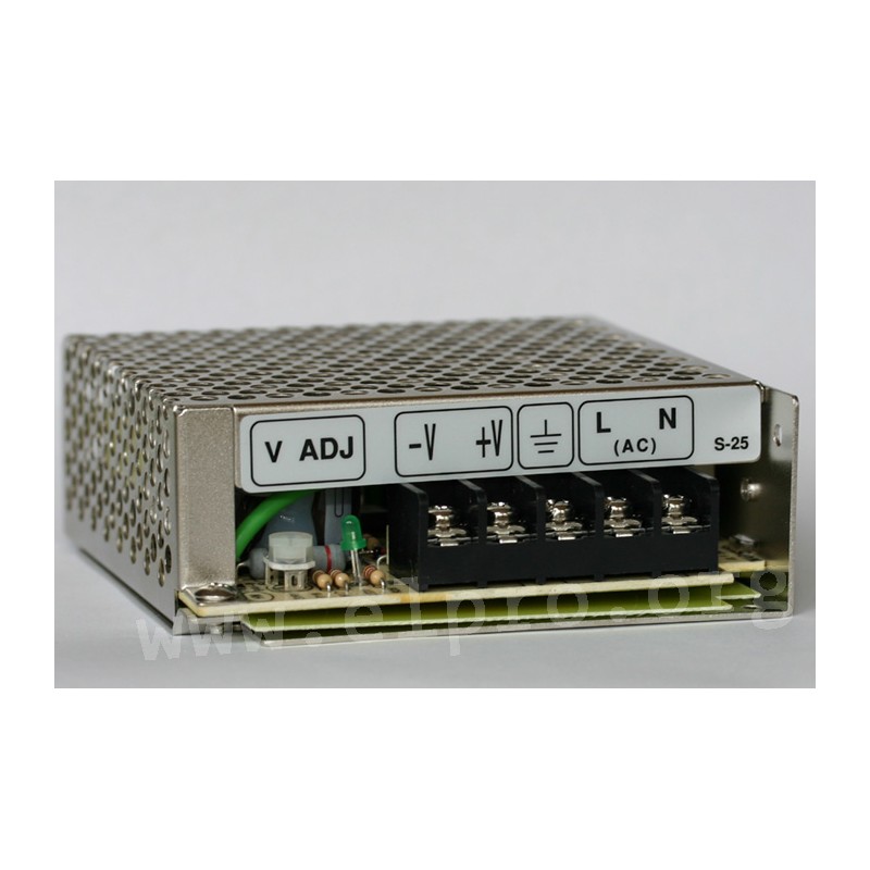 Switching power supplies in an enclosed housing with 25W, screw terminals and a universal input. These devices have a fanless design and are protected against overload, short circuit as well as overvoltage. They have a fixed switching frequency at 56kHz and comply with UL1012, EN60950-1, EN55022 class B, EN61000-3-2 as well as EN61000-3-3. We offer the following types of this Mean Well series: S-25-12 and S-25-15.