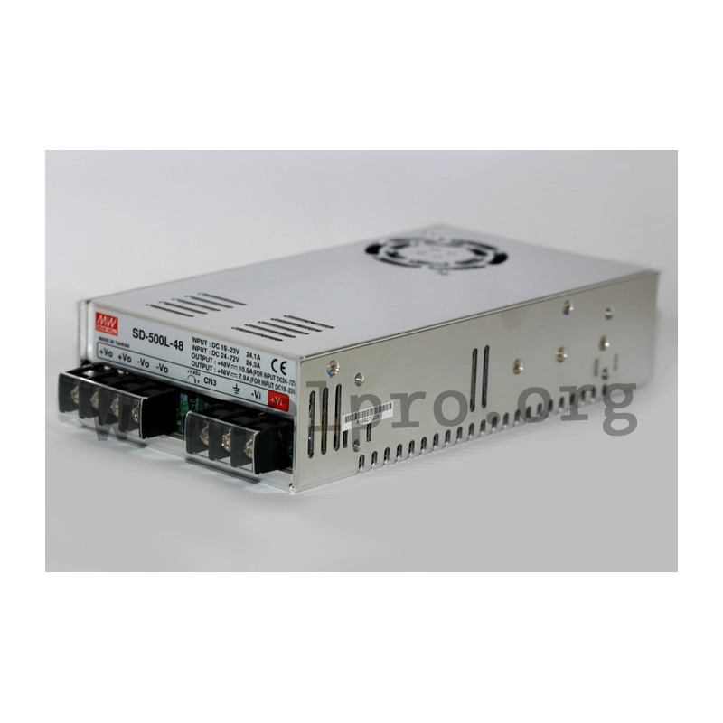 DC/DC converters in an enclosed housing with 500W, a built-in DC fan, a DC OK signal, a built-in remote ON/OFF control, an input voltage ratio of 4:1 and screw terminals. These devices have a galvanic isolation of input/output and are protected against overload, input voltage reversal, overtemperature, short circuit as well as overvoltage. They have a built-in remote sense function and comply with EN55032 class B. We offer the following types of this Mean Well series: SD-500L-12, SD-500L-24, SD-500L-48, SD-500H-12, SD-500H-24 and SD-500H-48.