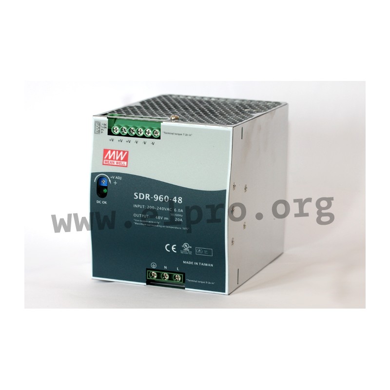 Switching power supplies in a slim housing (110mm width) with 960W, a built-in DC OK relay contact, an LED indicator for power on, a parallel function (3+1, 3840W), a universal input and screw terminals (touch guard). These devices have a built-in active PFC function and are protected against overload (auto recovery), overvoltage as well as short circuit. They are suitable for DIN rail mounting, have a fanless design, a high efficiency and comply with EN50082-2, EN61000-6-2, EN62368-1, EN55032, EN61204-3, EN61000-3-2 as well as EN61000-3-3. We offer the following type of this Mean Well series: SDR-960-24 and SDR-960-48.