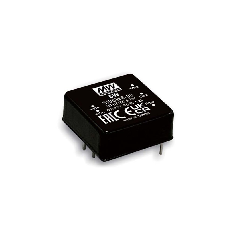 Converter modules in a 1"x1" housing with 6W, an input voltage ratio of 8:1 and a regulated output. These devices are suitable for PCB mounting and do not require a minimum load. They are protected against overload, short circuit (continuous) as well as overvoltage and comply with EN55032 class A as well as EN55032 class B. We offer the following types of this Mean Well series: SI06W8-03, SI06W8-05, SI06W8-09, SI06W8-12, SI06W8-15 and SI06W8-24.
