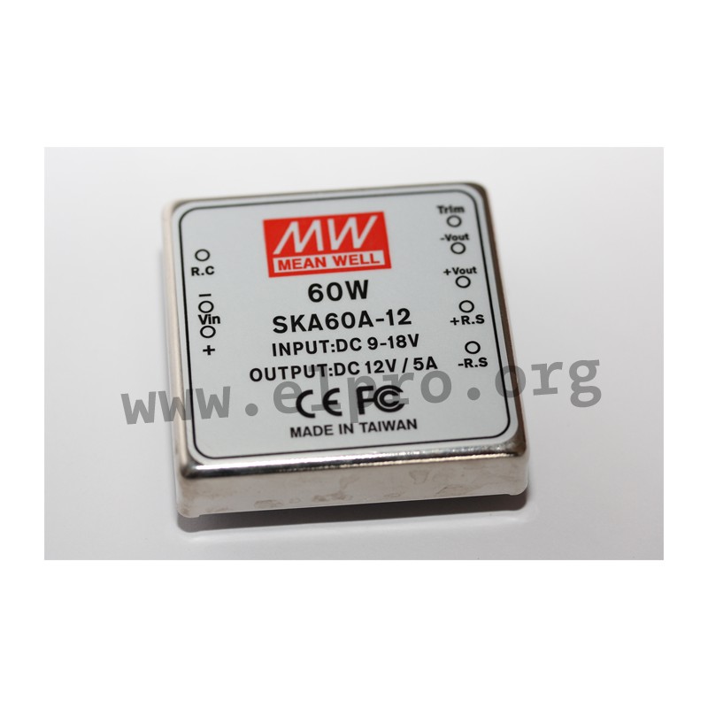 DC/DC converters in a 2"x2" DIL metal housing with 60W, a regulated output voltage, a remote ON/OFF control and a trimming output (±10%). These devices have a galvanic isolation of input/output, an input voltage ratio of 2:1 and are protected against overload, overvoltage as well as short circuit. They are suitable for PCB mounting and comply with EN55032 class A (without additional components). We offer the following types of this Mean Well series: SKA60A-05, SKA60A-12, SKA60A-15, SKA60B-05, SKA60B-12, SKA60B-15, SKA60C-05, SKA60C-12 and SKA60C-15.