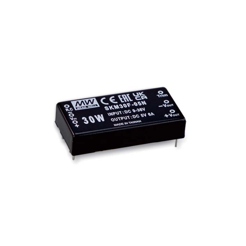 DC/DC converter modules in a 2"x1" housing with 30W, an input voltage ratio of 4:1, a trimming output (±10%) and a remote ON/OFF control. These devices are suitable for PCB mounting and are protected against overload, overvoltage as well as short circuit. They do not require a minimum load and comply with EN55032 class A. We offer the following types of this Mean Well series: SKM30F-05N, SKM30F-12N, SKM30F-15N, SKM30G-05N, SKM30G-12N and SKM30G-15N.