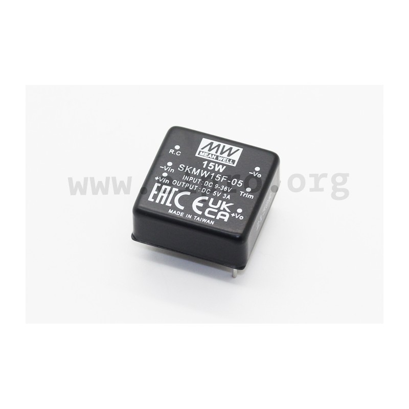 Regulated converter modules in a 1x1 inch housing with 15W and an ultra wide input range (4:1). These devices have an efficiency of up to 89%, do not require a minimum load and are protected against short circuit, overload as well as overvoltage. They are suitable for direct PCB mounting and comply with EN55032 class A. We offer the following types of this Mean Well series: SKMW15F-03, SKMW15F-05, SKMW15F12, SKMW15G-03, SKMW15G-05, SKMW15G-12 and SKMW15G-15.