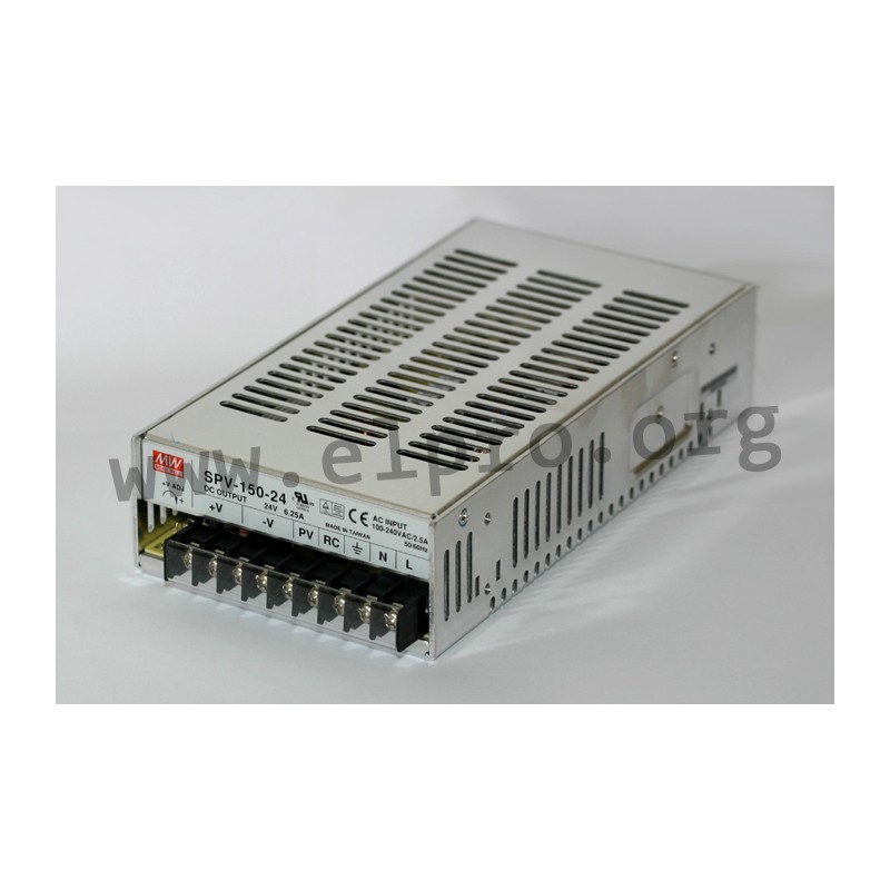 Switching power supplies in an enclosed housing with 150W, a programmable output voltage (20 to 110% / by an external control signal 1 to 5,5V DC), a universal input and screw terminals. These devices have a built-in active PFC function and are protected against overload (auto recovery), overtemperature, overvoltage as well as short circuit. They have a built-in remote ON/OFF control and comply with UL/EN60950-1, EN55032 class B, EN61000-3-2 as well as EN61000-3-3. We offer the following types of this Mean Well series: SPV-150-12, SPV-150-24 and SPV-150-48.