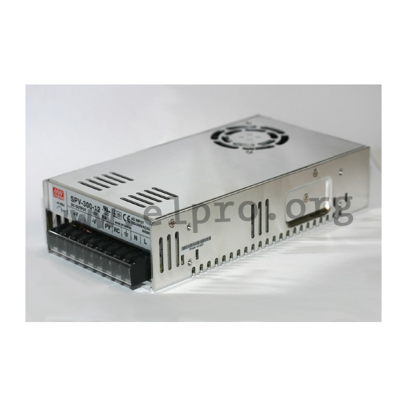 Switching power supplies in an enclosed housing with 300W, screw terminals, a fan, a universal input and a built-in remote ON/OFF control. These devices have a built-in active PFC function and are protected against overload (auto recovery), overtemperature, overvoltage as well as short circuit. They have a programmable output voltage (20 to 110% / by an external control signal 1 to 1,5V DC) and comply with UL/EN60950-1, EN55032 class B, EN61000-3-2 as well as EN61000-3-3. We offer the following types of this Mean Well series: SPV-300-12, SPV-300-24 and SPV-300-48.