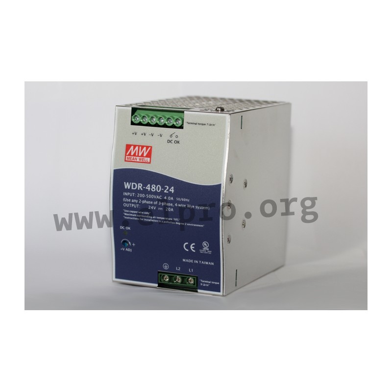 Switching power supplies in an enclosed housing with 480W, a built-in DC OK relay contact, a universal input, a two phase input and screw terminals (touch guard). These devices have a built-in active PFC function and are protected against overload (auto recovery), overvoltage as well as short circuit. They are suitable for DIN rail mounting and comply with EN61000-6-2, EN50082-2, EN62368-1, EN55032, EN61204-3 class B, EN61000-3-2, EN61000-3-3 as well as EN55024. We offer the following types of this Mean Well series: WDR-480-24 and WDR-480-48.