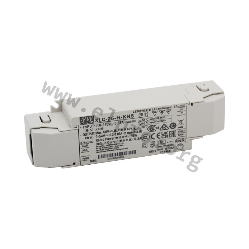 LED power supplies in a plastic case with 25W, a constant power, and a low no-load power (<0,5W). These devices are suitable for LED lighting applications, have a adjustable output current and comply with EN61347-1, EN61347-2-13, and EN55015. We offer the following types of this Mean Well series: XLC-25-H-KN and XLC-25-H-KNS.
