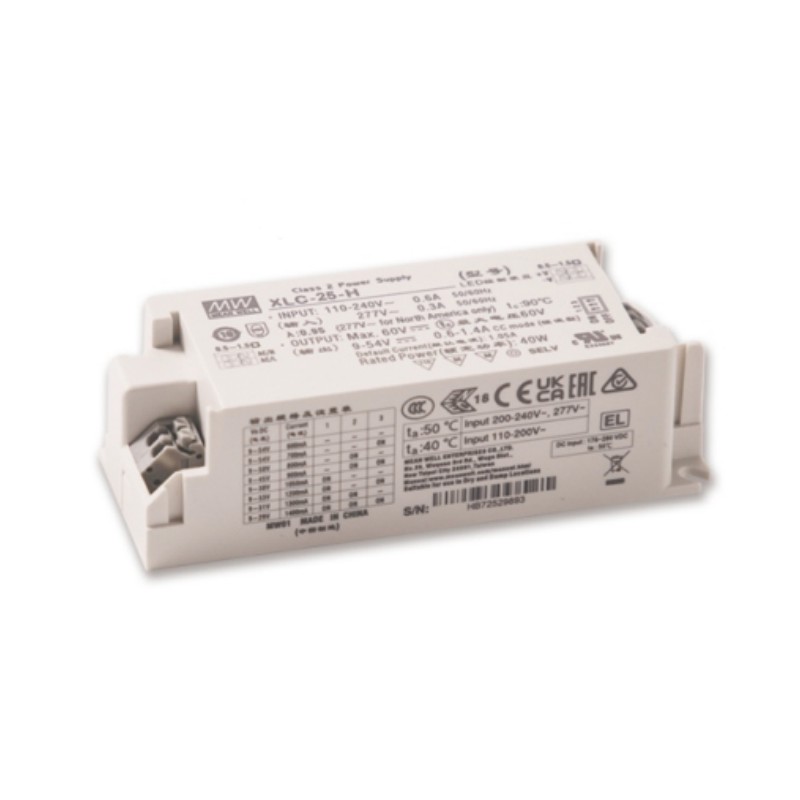 LED drivers in a plastic housing with 25W, a constant power, a low no-load power (<0,5W), a strain relief (XLC-25-H-_S_) and an NFC function (XLC-25-H-_N). These devices have a built-in active PFC function and are protected against short circuit as well as overtemperature. They are suitable for LED lighting applications, have an adjustable output current and comply with EN61347-1, EN61347-2-13, EN55015, EN61000-3-2 class C as well as EN61000-3-3. We offer the following types of this Mean Well series: XLC-25-H, XLC-25-H-N, XLC-25-H-S and XLC-25-H-SN.