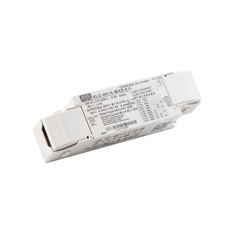 LED power supplies in a plastic case with 40W, a constant power, and a low no-load power (<0,5W). These devices are suitable for LED lighting applications, have a adjustable output current and comply with EN61347-1, EN61347-2-13, and EN55015. We offer the following types of this Mean Well series: XLC-40-H-MA and XLC-40-H-MAS.