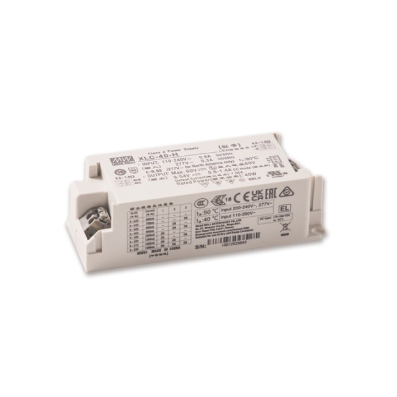 LED drivers in a plastic housing with 40W, a constant power, an NFC function (XLC-40-H-_N), a strain relief (XLC-40-H-_S_) and a low no-load power (<0,5W). These devices have a built-in active PFC function, an adjustable output current and are protected against short circuit as well as overtemperature. They are suitable for LED lighting applications and comply with EN61347-1, EN61347-2-13, EN62384, EN55015, EN61000-3-2 class C as well as EN61000-3-3. We offer the following types of this Mean Well series: XLC-40-H, XLC-40-H-N, XLC-40-H-S and XLC-40-H-SN.
