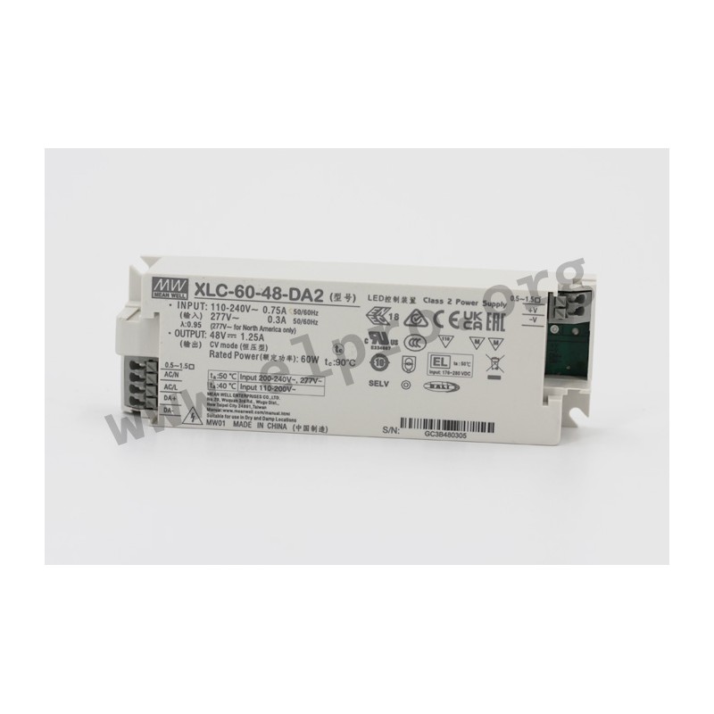 LED drivers in a plastic housing with 60W, a constant voltage, a low no-load power (<0,5W), a dimming function and a DALI-2 interface. These devices have a built-in active PFC function and are protected against overload (auto recovery), overvoltage, overtemperature as well as short circuit. They are suitable for LED lighting applications and comply with EN62386-101/102/207, EN61347-1, EN61347-2-13, EN55015, EN61547, EN61000-3-2 class C as well as EN61000-3-3. We offer the following types of this Mean Well series: XLC-60-12-DA2, XLC-60-12-DA2S, XLC-60-24-DA2, XLC-60-24-DA2S, XLC-60-48-DA2 and XLC-60-48-DA2S.
