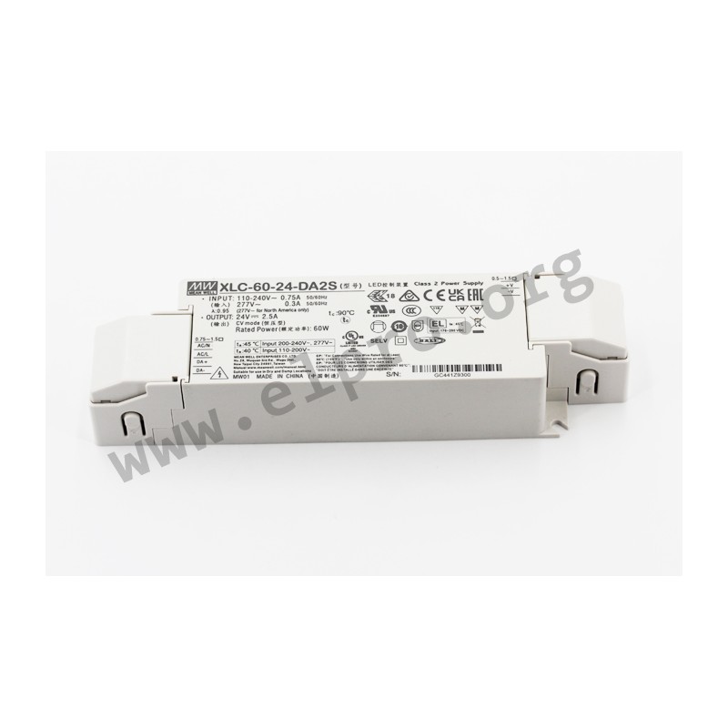 LED drivers in a plastic housing with 60W, a constant voltage, a low no-load power (<0,5W), a dimming function and a DALI-2 interface. These devices have a built-in active PFC function and are protected against overload (auto recovery), overvoltage, overtemperature as well as short circuit. They are suitable for LED lighting applications and comply with EN62386-101/102/207, EN61347-1, EN61347-2-13, EN55015, EN61547, EN61000-3-2 class C as well as EN61000-3-3. We offer the following types of this Mean Well series: XLC-60-12-DA2, XLC-60-12-DA2S, XLC-60-24-DA2, XLC-60-24-DA2S, XLC-60-48-DA2 and XLC-60-48-DA2S.