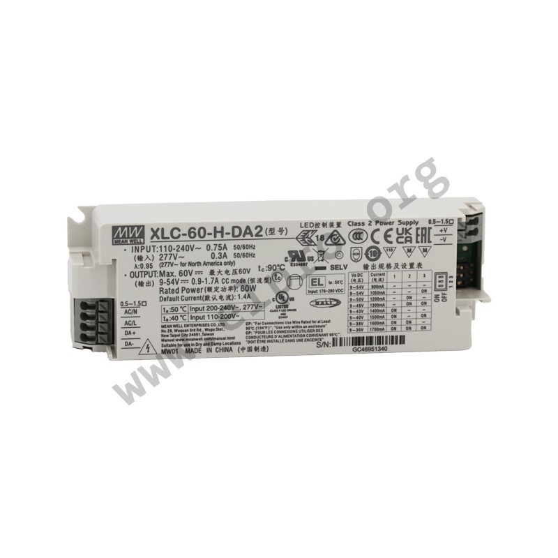 LED drivers in a plastic housing with 60W, a DALI-2 interface, an NFC function (XLC-60_N), a dimming function, a strain relief (XLC-60-H-S_) and an adjustable output current. These devices have a built-in active PFC function and are protected against overtemperature as well as short circuit. They are suitable for LED lighting applications, have a low no-load power (<0,5W) and comply with IEC62386-101/102/207, EN61347-1, EN61347-2-13, EN55015, EN61000-3-2 class C as well as EN61000-3-3. We offer the following types of this Mean Well series: XLC-60-H-DA2, XLC-60-H-DA2N, XLC-60-H-DA2S and XLC-60-H-DA2SN.