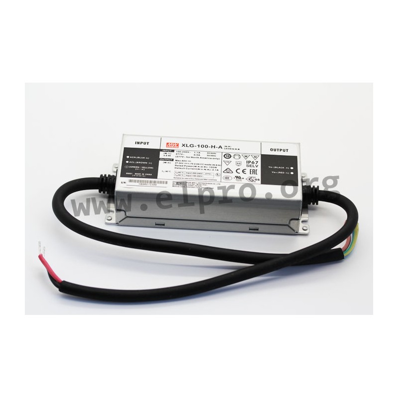 LED drivers in a metal housing (IP67) with a constant current / constant voltage (mixed mode), 100W and a universal input. These devices are protected against overload (auto recovery), overcurrent, overtemperature, overvoltage as well as short circuit and comply with EN61347-1, EN61347-2-13, EN62384, EN55015, EN61000-3-2 class C, EN61000-3-3, EN61547 as well as a 6kV surge immunity level. They have a built-in active PFC function and are suitable for LED lighting applications. We offer the non-dimmable types XLG-100-12-A and XLG-100-24-A, the power power supplies XLG-100-L-A and XLG-100-H-A with a constant power as well as the LED drivers XLG-100-L-AB and XLG-100-H-AB with a constant power and a 3 in 1 dimming function (0 to 10V DC, 10V PWM, potentiometer).