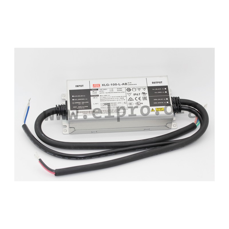 LED drivers in a metal housing (IP67) with a constant current / constant voltage (mixed mode), 100W and a universal input. These devices are protected against overload (auto recovery), overcurrent, overtemperature, overvoltage as well as short circuit and comply with EN61347-1, EN61347-2-13, EN62384, EN55015, EN61000-3-2 class C, EN61000-3-3, EN61547 as well as a 6kV surge immunity level. They have a built-in active PFC function and are suitable for LED lighting applications. We offer the non-dimmable types XLG-100-12-A and XLG-100-24-A, the power power supplies XLG-100-L-A and XLG-100-H-A with a constant power as well as the LED drivers XLG-100-L-AB and XLG-100-H-AB with a constant power and a 3 in 1 dimming function (0 to 10V DC, 10V PWM, potentiometer).