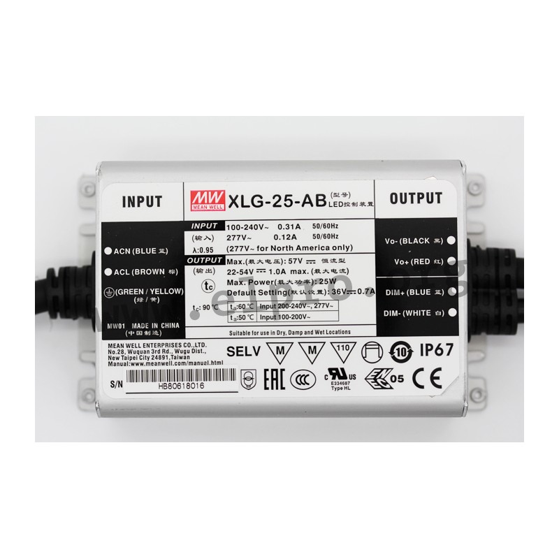 LED drivers in a metal housing (IP67) with 25W, a constant power and a low no-load power, a surge immunity level of 6kV and EN61000-3-2 Class C. These devices are protected against overload (auto recovery), short circuit, overtemperature as well as overvoltage and are suitable for LED lighting applications. They comply with EN61347-1, EN61347-2-13, EN62384, EN55015, EN61000-3-3 as well as EN61547 and have a built-in active PFC function. We offer the types XLG-25-A as well as XLG-25-AB of this Mean Well series. Both have a potentiometer for current adjustment. Furthermore, the type XLG-25-AB is equipped with a 3 in 1 dimming function (0 to 10V DC, 10V PWM, potentiometer).