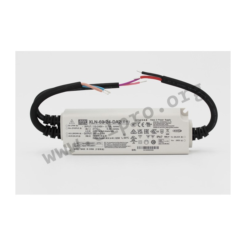 LED drivers in a plastic housing (IP67) with 60W, a constant voltage, a dimming function, a DALI-2 interface and a low no-load power (<0,5W). These devices have a built-in active PFC function and are protected against overload (auto recovery), overvoltage, short circuit as well as overtemperature. They are suitable for LED lighting applications and comply with EN61347-1, EN61347-2-13, EN55015, EN61000-3-3 as well as EN61000-3-2 class C. We offer the following types of this Mean Well series: XLN-60-12-DA2, XLN-60-24-DA2 and XLN-60-48-DA2.