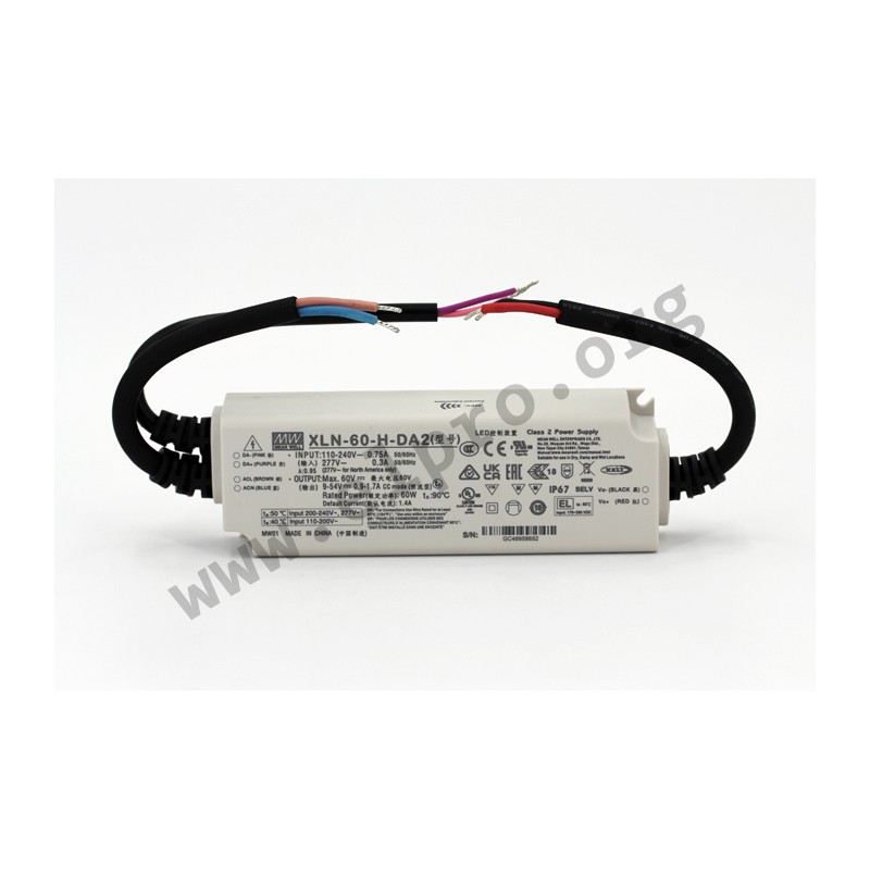 LED drivers in a plastic housing (IP67) with 60W, a dimming function, an NFC function, a DALI-2 interface and a constant power. These devices have a built-in active PFC function and are protected against overload (auto recovery), overvoltage, overtemperature as well as short circuit. They are suitable for LED lighting applications and comply with EN61347-1, EN61347-2-13, EN55015, EN61000-3-2 class C, EN61000-3-3 as well as EN62386-101/102/207. We offer the type XLN-60-H-DA2 of this Mean Well series.