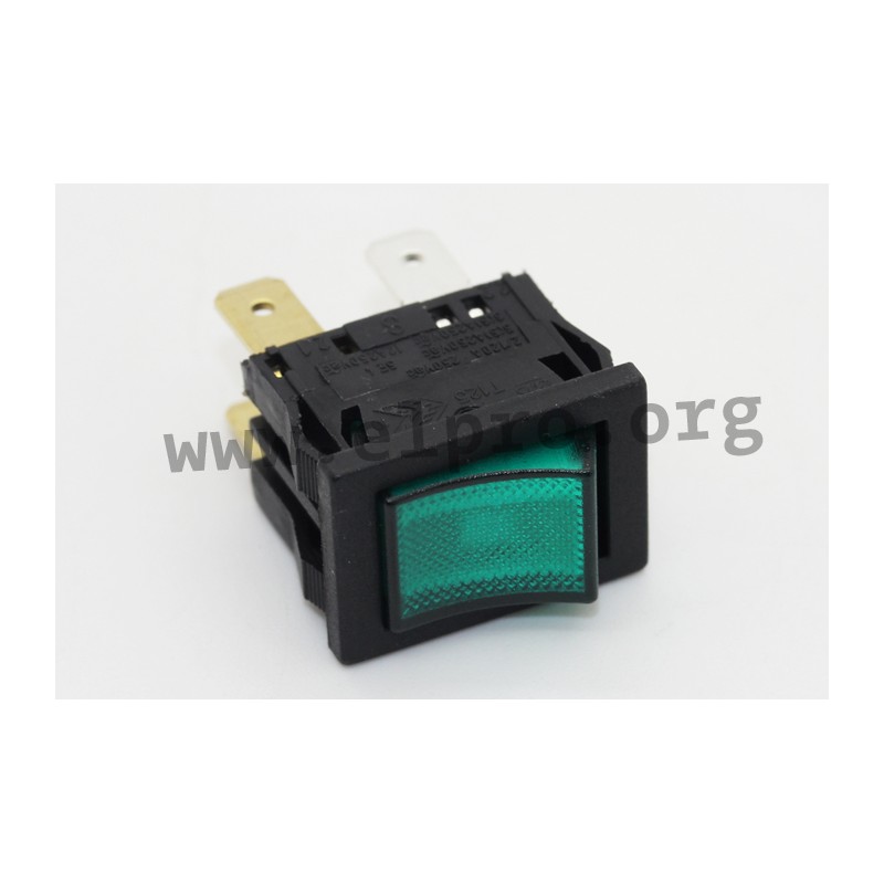 Rocker switches for 13 x 19mm panel cut-outs and with a switching current of 12A as well as a maximal voltage of 250V AC. These 2-pole switches with a blade terminal (4,8 x 0,8mm) have a contact gap of 3mm and are in compliance with the flammability class UL 94 V2. Furthermore, they are suited for a maximal ambient temperature of 125°C. We offer the type GP12H1121M00 with a black rocker, the type GP18H1E00M00 with a green illuminated rocker and the type GP18H1G00M00 with a red illuminated rocker.