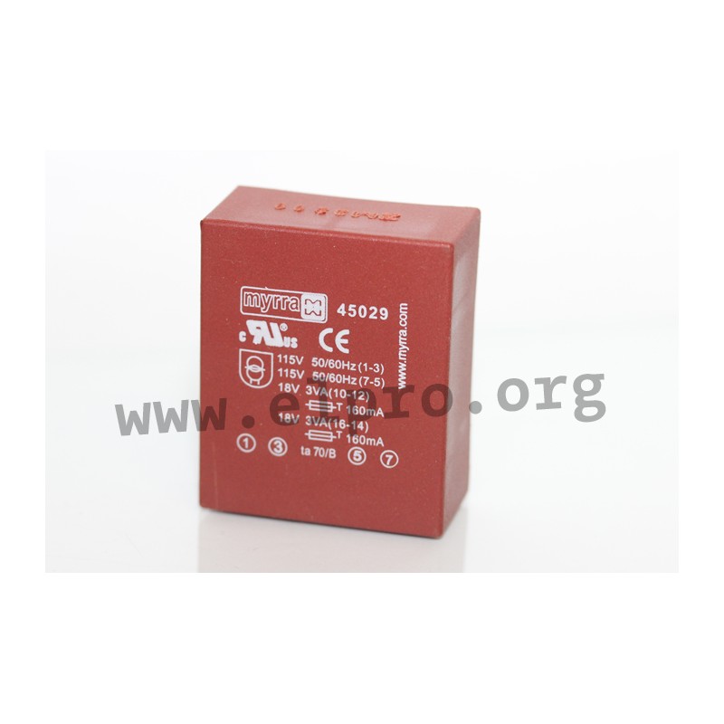Vacuum encapsulated flat transformers with 6VA, a two chamber winding and a UI30 core. These devices are suitable for PCB mounting as well as for 115/230V power supplies. They comply with EN61558 as well as UL506. We offer the following types of this Myrra series: 45025, 45026, 45027, 45028 and 45029.
