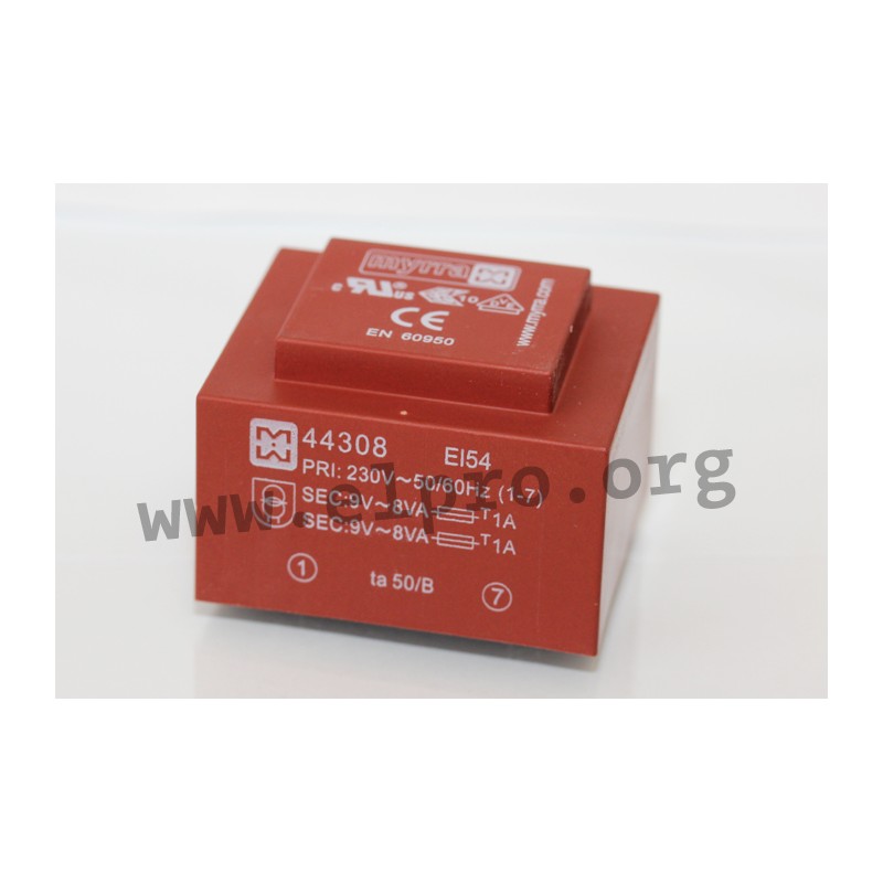 Transformers with an EI54 core and 16VA. These components are suitable for PCB mounting and are not short circuit proof. They comply with temperature resistance class Ta 50/B as well as EN61558-1. We offer the following types of this Myrra series: 44301, 44302, 44303, 44304, 44305, 44306, 44308, 44309, 44310 and 44311.