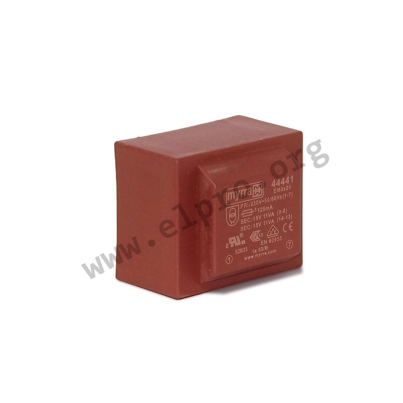 Transformers with an EI 60 core and 22VA. These components are suitable for PCB mounting and are not short circuit proof. They comply with temperature resistance class Ta 50/B as well as EN61558-1. We offer the following types of this Myrra series: 44440 and 44441.
