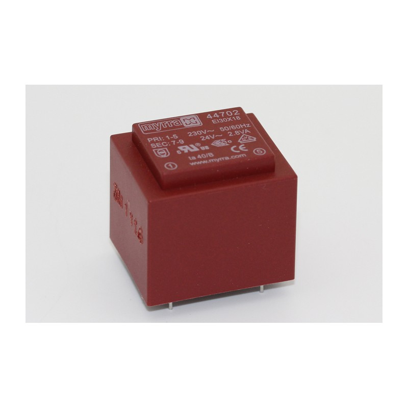 Transformers with 2,8VA and an EI30 core. These devices are short circuit proof and suitable for PCB mounting. They comply with temperature resistance class Ta 70/B as well as EN61558-2-6 and EN60950. We offer the following types of this Myrra series: 44697, 44698, 44699, 44700, 44701, 44702, 44703, 44704, 44705 and 4706.