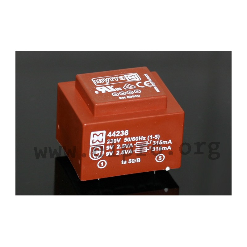 Transformers with 5VA and an EI42 core. These devices are suitable for PCB mounting and are not short circuit proof. They comply with temperature resistance class Ta 50/B as well as EN61558-1. We offer the following types of this Myrra series: 44229, 44230, 44231, 44232, 44233, 44234, 44235, 44236, 44237 and 44238.