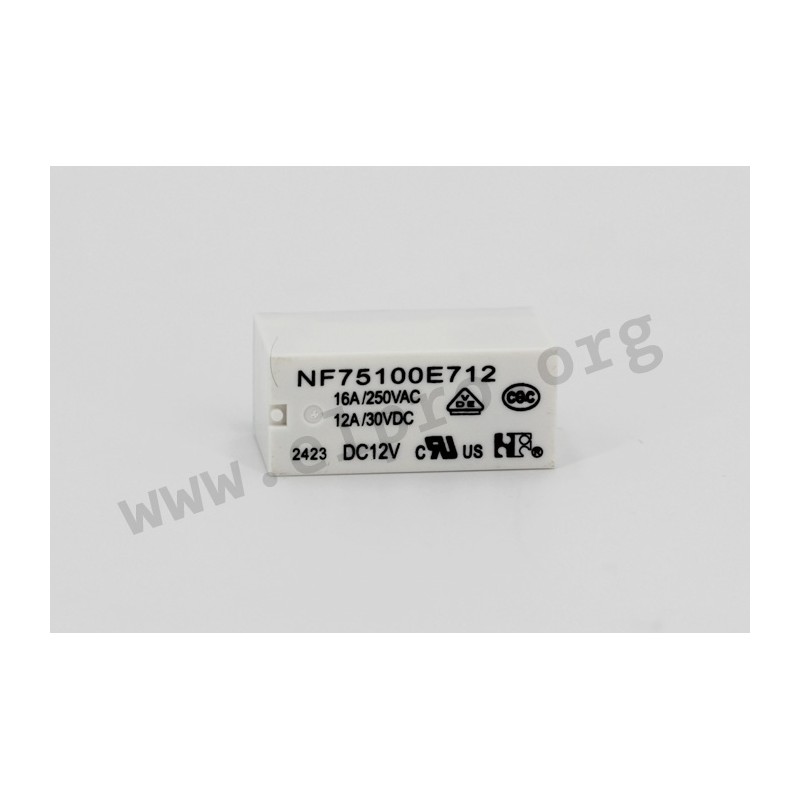 These PCB relays have a low profile (12,5cm), they have a voltage resistance of 5kV/8mm (between inductor and contact), a UL isolationsystem of the class F, as well as they conform with the environmental prottection RTII. These passive elements have a DC inductor current of 410mW, as well as they are suitable for temperatures of up to 85°C geeignet, they belong to the material group of insulation parts IIIa, and fit into the over voltage category II. We offer the following types of this NF series: NF75-001E12, NF75-001E24, NF75-100E12, NF75-100E24, NF75-001E712, NF75-001E724, NF75-100E712, and NF75-100E724