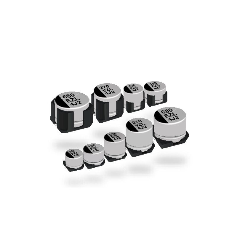 Polymer hybrid aluminium electrolytic capacitors in an SMD housing with a low ESR and a long service life (4000h at +125°C). These caps comply with AEC-Q200 and are suitable for a wide operating temperature range. They are very reliable and partly vibration-proof (EEHZL1_V). We offer the following types of this Panasonic series: EEHZL1E820R, EEHZL1E151P, EEHZL1E151V, EEHZL1E221XP, EEHZL1E221XV, EEHZL1E471P, EEHZL1E471V, EEHZL1E681P, EEHZL1E681V, EEHZL1V470R, EEHZL1V820P, EEHZL1V820V, EEHZL1V151XP, EEHZL1V151XV, EEHZL1V271P, EEHZL1V271V, EEHZL1V471P and EEHZL1V471V.