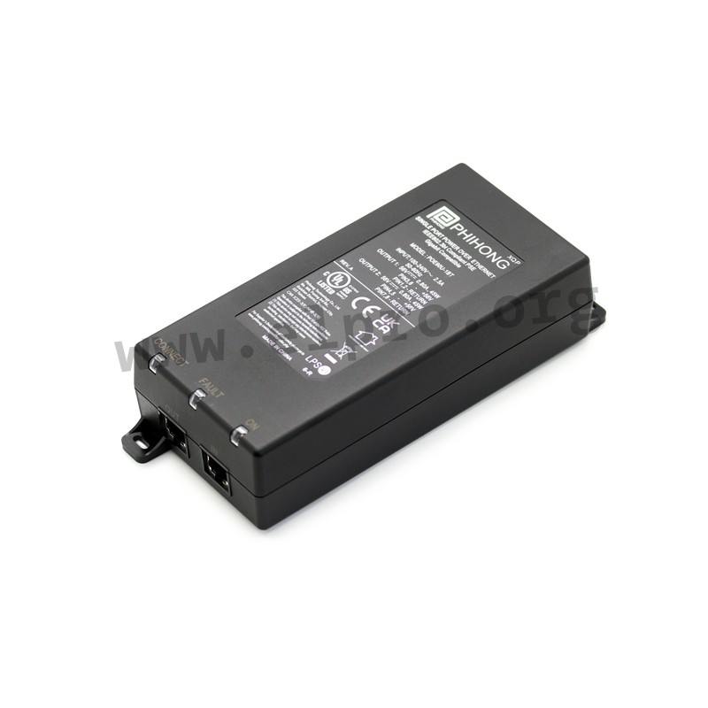 PoE injectors with 90W, a single port, protection class I and a universal input. These desktop switching power supplies are suitable for power supply through data lines and are protected against overload, overvoltage as well as short circuit. They have an LED status display and comply with IEC60950-1, IEC62368-1, UL60950-1, UL62368-1, EN55032 class B as well as IEEE802.3bt (Hi-PoE). We offer the type POE90U-1BT6 of this Phihong series.