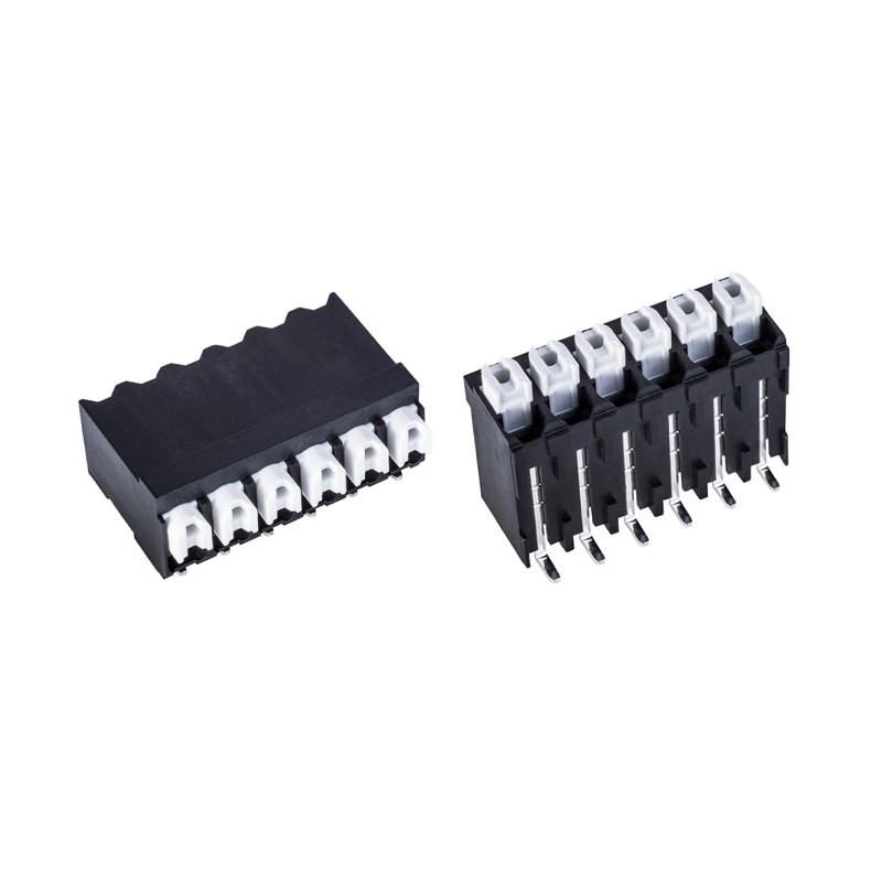 These SMD spring terminal blocks with a confirmation push button have a horizontal or vertical wire entry and a horizontal or vertical screw direction. They have a pitch of 3,5mm and are reflow proof. These terminal blocks are available as a horizontal terminal block with blister strap on wheels (AK4601_V-BK-SMD), as well as a vertical terminal block with blister strap on wheels (AK4601_H-BK-SMD). We offer various types of this PTR Hartmann series.