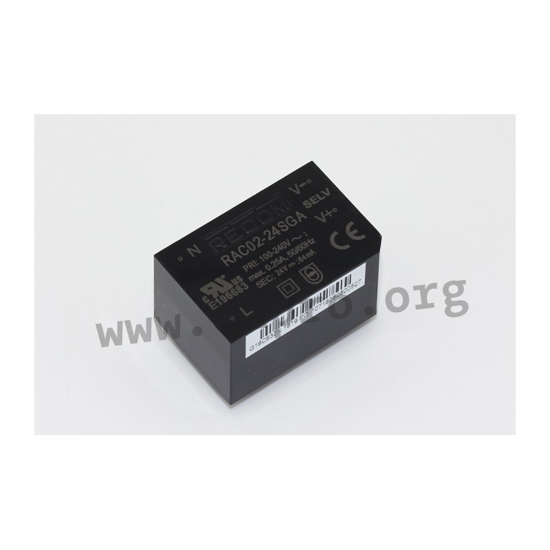 AC/DC converter modules in an enclosed plastic housing with 2W, a low no-load power and a universal input. These devices are suitable for direct PCB mounting, are protected against overcurrent as well as short circuit and comply with EN62368-1, EN61000-3-3 as well as EN55032 class A. We offer the following types of this Recom series: RAC02-3.3SGA, RAC02-05SGA, RAC02-12SGA, RAC02-15SGA and RAC02-24SGA.