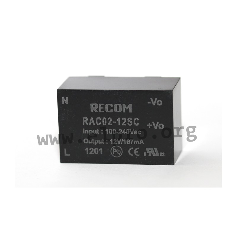 AC/DC converter modules in an enclosed plastic housing with 2W, a universal input and a low no-load power. These devices are suitable for PCB mounting and are protected against overload, overtemperature as well as short circuit. We offer the following types of this Recom series: RAC02-3.3SC, RAC02-05SC, RAC02-09SC, RAC02-12SC and RAC02-24SC.