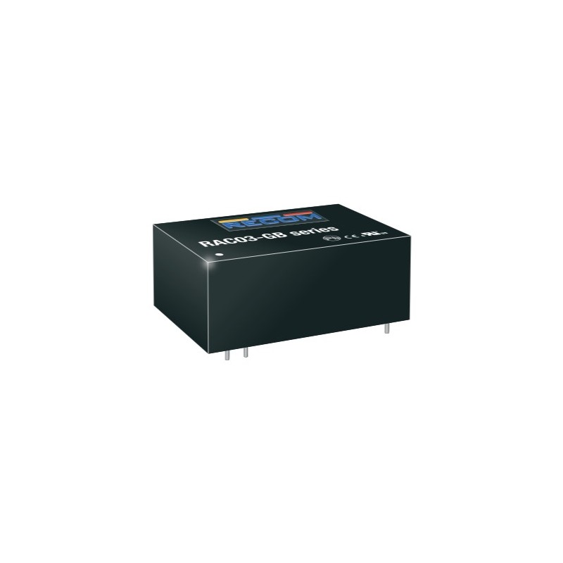 AC/DC converter modules in a plastic case with a universal input and a low no-load power consumption. These devices are suitable for PCB mounting and are protected against overload (auto recovery), overvoltage as well as short circuit. They comply with EN60950-1 as well as EN55032 class A. We offer the following types of this Recom series: RAC03-05SGB and RAC03-12SGB.