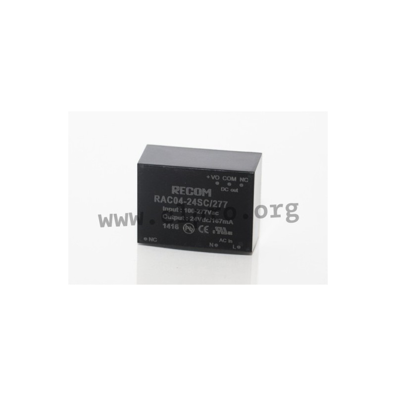 AC/DC converter modules with 4W, a universal input and a low no-load power (<50mW). These devices are suitable for PCB mounting, are protected against overload as well as short circuit and comply with EN60950-1, EN55032 as well as EN55024. We offer the following types of this Recom series: RAC04-5SC/277, RAC04-12SC/277, RAC04-24SC/277, and RAC04-12DC/277-E.