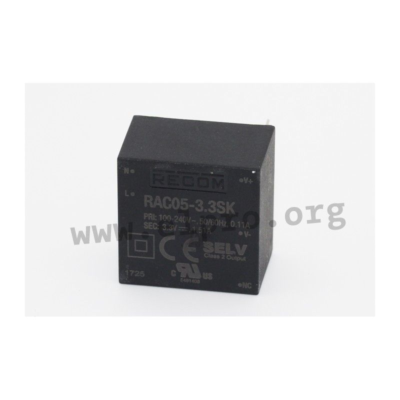 AC/DC converter modules in an enclosed 1"x1" plastic housing with 5W and a universal input. These devices are suitable for PCB mounting and are protected against overload (auto recovery), overvoltage as well as short circuit. They have a high efficiency and comply with EN60950-1, EN62368-1 as well as EN61000-3-3. We offer the following types of this Recom series: RAC05-3.3SK, RAC05-05SK, RAC05-12SK, RAC05-15SK and RAC05-24SK.