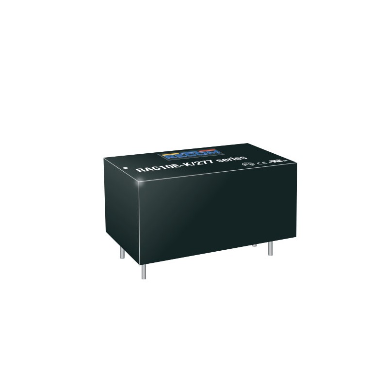 AC/DC converters in an enclosed plastic housing with 10W, a universal input and a peak load capability of 140%. These devices are suitable for PCB mounting and are protected against overload, short circuit as well as overvoltage. They have a low no-load power (<100mW), are suitable for an operating altitude of up to 5000m and comply with EN62368-1 as well as EN60335-1. We offer the following types of this Recom series: RAC10E-3.3SK/277, RAC10E-05SK/277, RAC10E-12SK/277, RAC10E-15SK/277 and RAC10E-24SK/277.