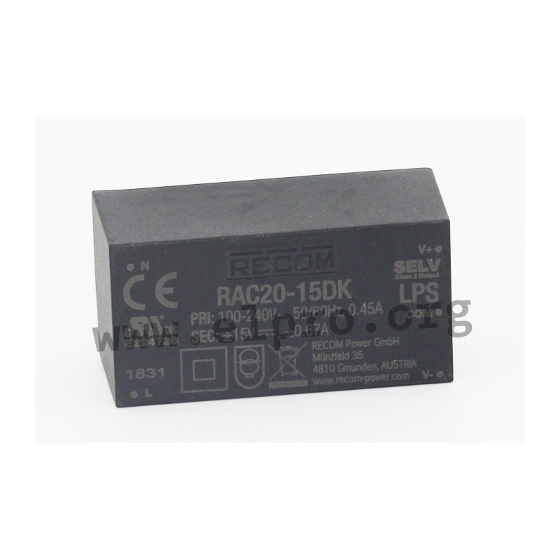 AC/DC converters in an enclosed plastic housing with 20W, a low no-load power (<40mW) and a universal input. These devices are suitable for PCB mounting and are protected against short circuit. They have a single (RAC20-_SK) or a dual output (RAC20-_DK), are suitable for an operating altitude of up to 5000m and comply with UL/EN62368-1, EN60335, EN61558-1, EN61558-2-16, EN61204-3, EN55032/14 as well as EN55024. We offer the following types of this Recom series: RAC20-05SK, RAC20-12SK, RAC20-15SK, RAC20-24SK, RAC20-48SK, RAC20-12DK and RAC20-15DK.