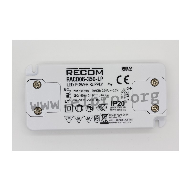 LED drivers in a plastic housing (IP20) with 6W, a constant current, a universal input and a low profile (11mm). These devices are suitable for LED lighting applications and are protected against overload (auto recovery) as well as short circuit. They are not dimmable and comply with EN55015, EN61347-1, EN61347-2-13, IEC61347-1 as well as IEC61347-2-13. We offer the following types of this Recom series: RACD06-350-LP, RACD06-500-LP and RACD06-700-LP.
