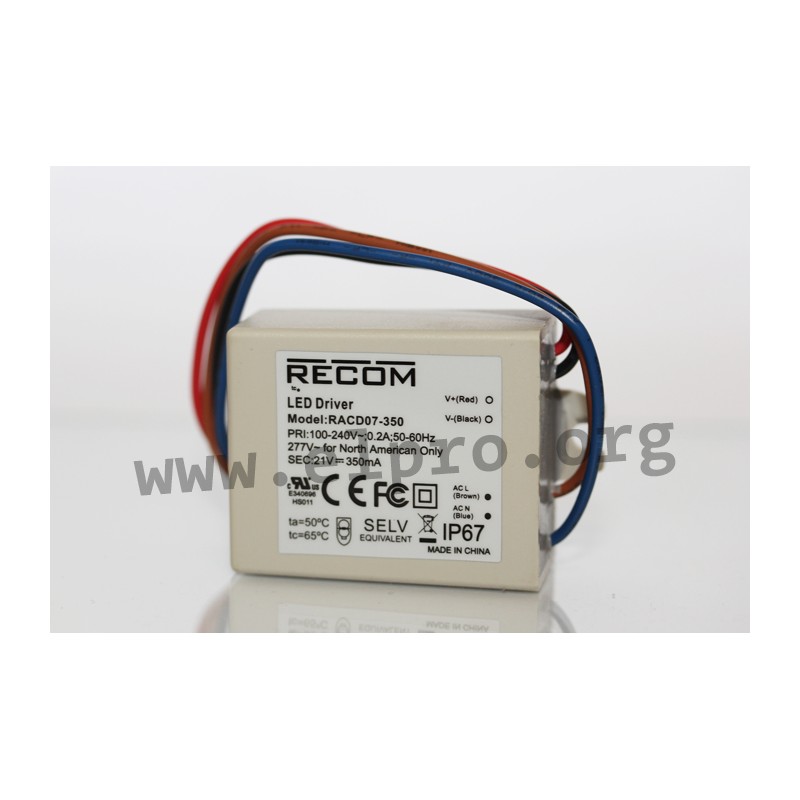 LED drivers in a plastic housing (IP67) with 7W, a constant current, protection class II and a universal input. These devices are suitable for LED lighting applications and are protected against overload (through current limiting), overvoltage as well as short circuit. They are not dimmable and comply with UL8750, UL1310, EN55015, EN61347-1, EN61347-2-13, IEC61347-2-13 as well as IEC61347-1. We offer the following types of this Recom series: RACD07-350 and RACD07-700.
