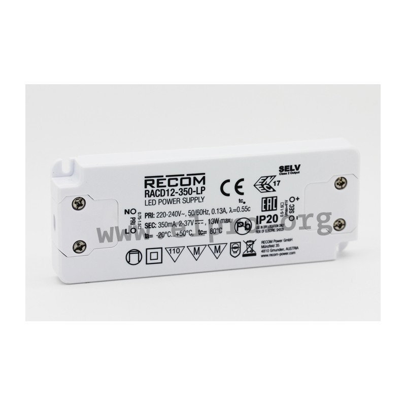 LED drivers in a plastic housing (IP20) with 12W, a constant current, a low profile (13mm) and a universal input. These devices are suitable for LED lighting applications and are protected against overload (auto recovery) as well as short circuit. They are not dimmable and comply with EN55015, EN61347-1, EN61347-2-13, IEC-61347-1 as well as IEC61347-2-13. We offer the following types of this Recom series: RACD12-350-LP, RACD12-500-LP and RACD12-700-LP.